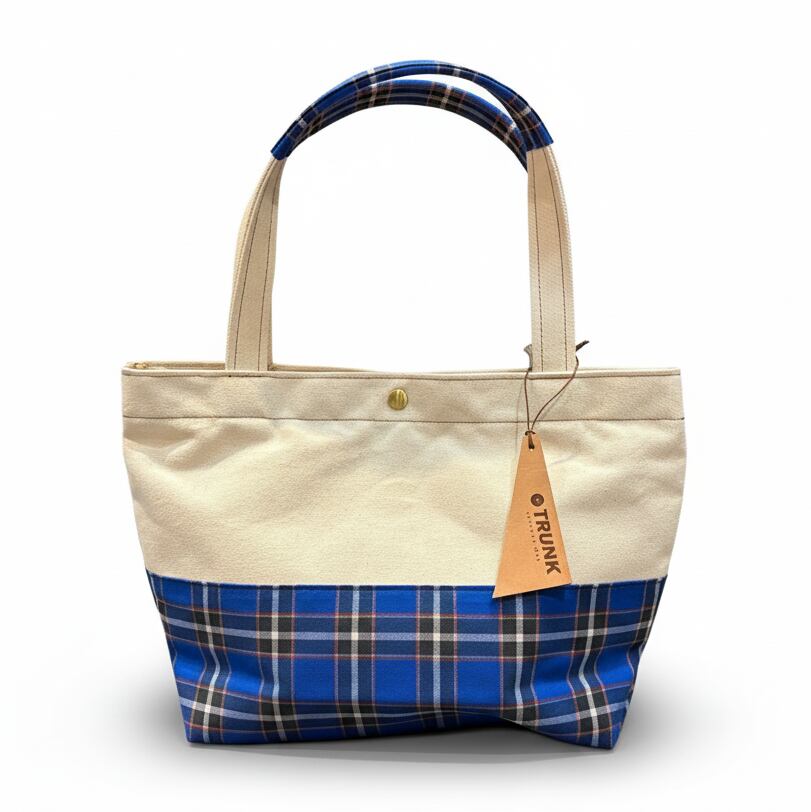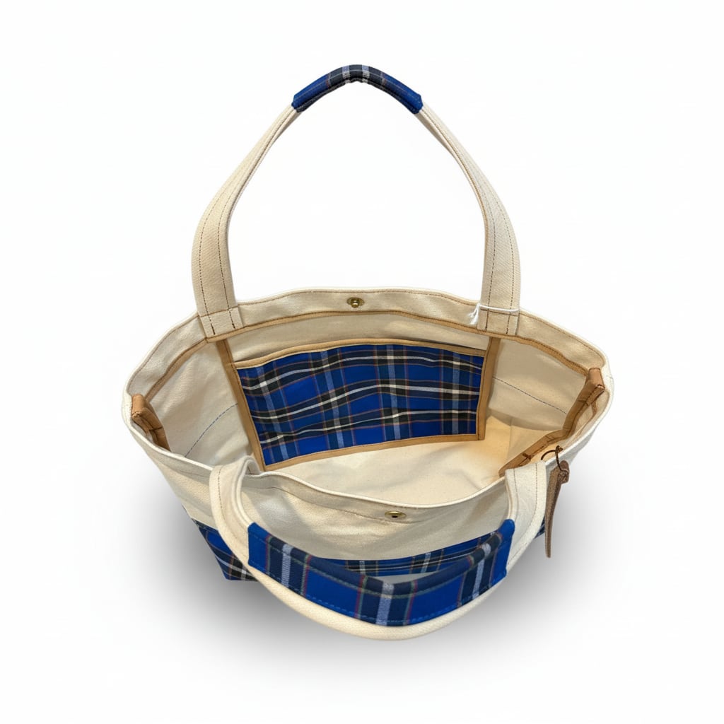 跳び箱や体操マットに使われている国産6号帆布の丈夫さと、播州織の神戸タータンの鮮やかな色合いが大人かわいいトートバッグです。生地はしっかり頑丈な国産の帆布を使用していますので、日常使いも気兼ねなくできます。使えば使うほどしなりやシワ感が出てきて、経年変化も楽しめます。内部のポケットも神戸タータンがアクセントになっています。
