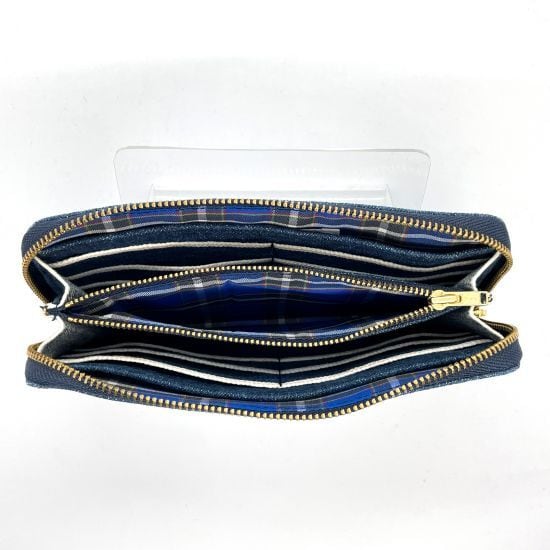 岡山デニム X 播州織神戸タータン、表側が岡山デニム、内側が神戸タータンの播州織のコラボ商品です。